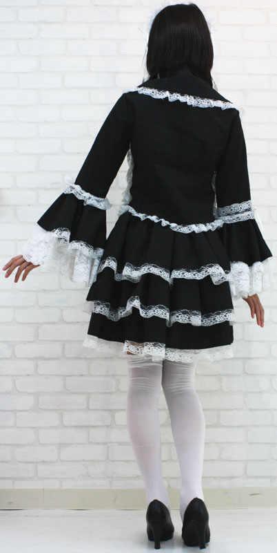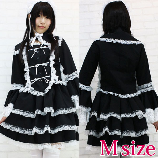 仕様:Mサイズ:B76〜82cm・W64〜100ccm 丈:上着48cm(袖62cm・肩幅37cm)・スカート47cm セット内容:ジャケット(前ボタン留め、姫袖)・別衿・ヘッドドレス(総レース仕様、バラのコサージュ付き)・スカート(ウェストゴム入り)