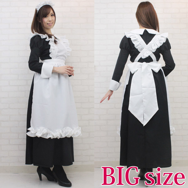 仕様:BIGサイズ:B92〜103cm・W70〜90cm 丈:ワンピース130cm(肩幅40cm、袖丈57cm)、エプロン115cm セット内容:ワンピース(首周りホック有り、後ろファスナー)・エプロン(2段階長さ調節ボタンあり)・カチューシャ