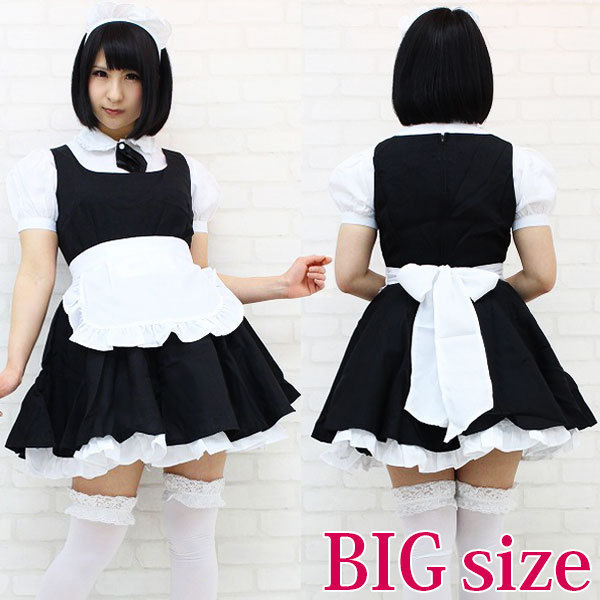 仕様:BIGサイズ:B〜104cm・W〜86cm 丈:ワンピース83cm(裾フリル含む)・ブラウス63cm(袖丈25cm、袖幅35cm、肩幅47cm、首周り43cm) セット内容:ブラウス、タイ(ナップボタンにて取り外し可能)、ワンピース(背中ファスナー)、エプロン、カチューシャ