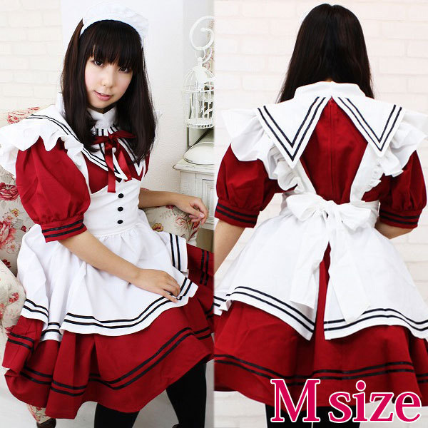 仕様:Mサイズ:B78〜86cm・W62〜94cm 丈:ワンピース78cm(肩幅35cm、袖丈26cm、袖口29cm)・エプロン68cm セット内容:ワンピース(ウエストゴム入り、後ろファスナー、前飾りボタン付き・襟付き)・エプロン(前飾りボタン付き)・カチューシャ