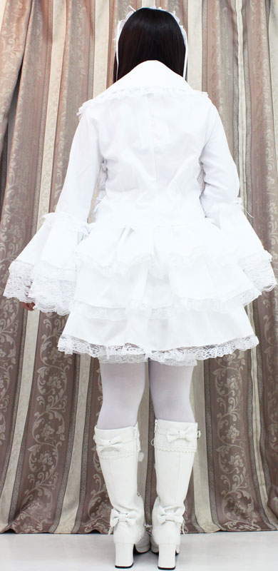 仕様:Mサイズ:B〜92cm・W63〜110cm 丈:上着48cm(袖丈63cm・肩幅38cm)・付け襟(首回り)41cm・スカート48cm セット内容:上着(前ボタン)・スカート(ウエスト部分ゴム、スカート3枚仕立て、裏地付き、チュールパニエ付き)・付け衿(ボタンにて着脱可)・ヘッドドレス