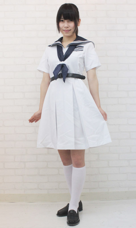 ちょっぴり長め丈の夏服ワンピが清楚な印象!ベルトがポイントになるので脚長効果も抜群!もちろん紺色のスカーフもセットです。