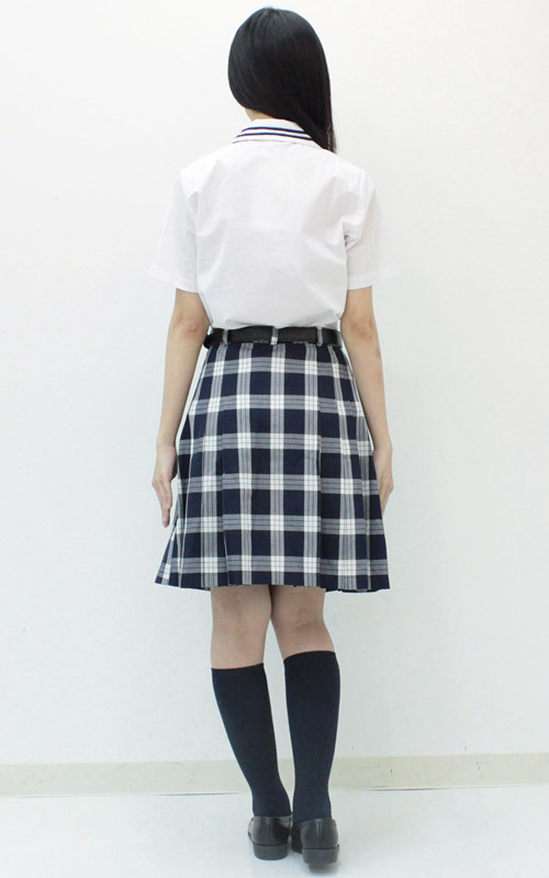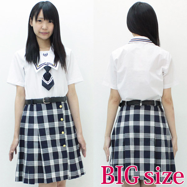 チェック柄のボックスプリーツスカートについた金ボタンがとってもオシャレな夏服仕様の制服コスチューム(ベルト付き)です。