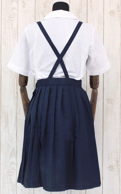 膝丈のプリーツスカートは、ウエスト部分で肩紐をボタン留めするタイプ。
