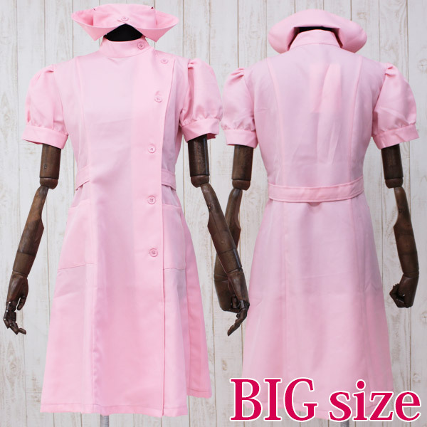 仕様:BIGサイズ:B98〜108cm・W86〜96cm ワンピース:着丈110cm 肩幅48cm 首周り45cm 袖丈28cm 袖口周り35cm セット内容:ワンピース(前ボタン留め・立て襟・ポケット付き・裏地無し)、ナースキャップ 素材:ポリエステル100%