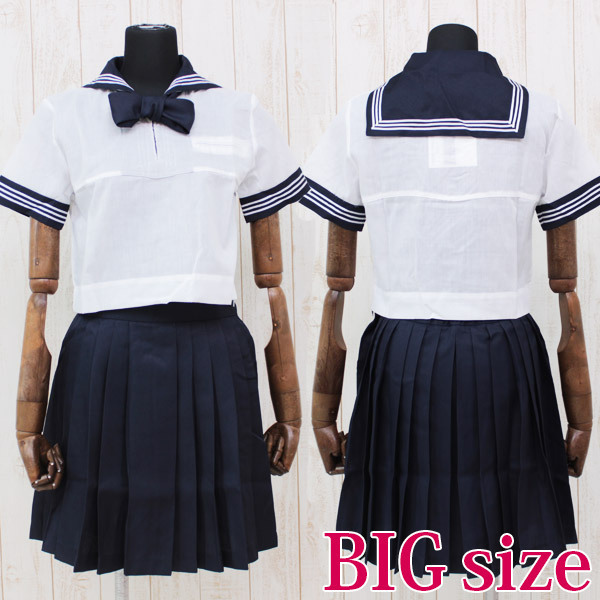 仕様:BIGサイズ:B〜106cm・W〜88cm 上衣:着丈46cm 袖丈22cm 肩幅45cm スカート丈49cm リボン100cm セット内容:上衣(前ボタン留め、襟・袖に各3本ライン入り、横ファスナー)、スカート(ウェストに一部ゴム入り、ボタン留め、横ファスナー)、リボン 素材:上衣(綿35%、ポリエステル65%) 他(ポリエステル100%)
