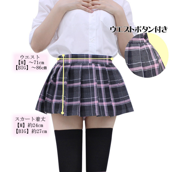 ●ミニスカート単品●黒×グレー×ピンクの可愛いチェック柄●横ファスナーあり・ボタン留め・ウエスト一部ゴム入り●制服コスプレに最適●レディース用Mサイズ。