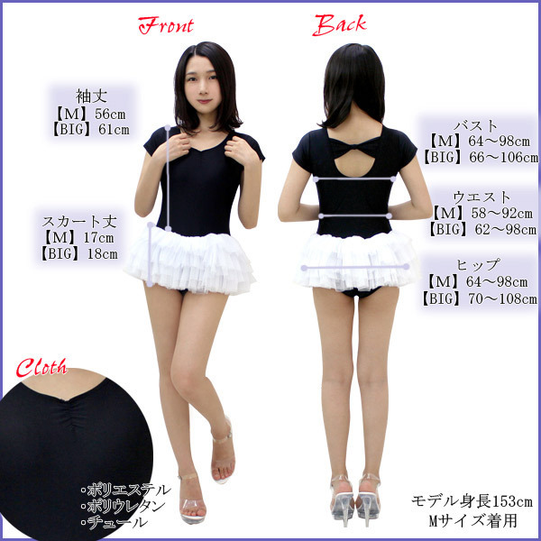 仕様:BIGサイズ:B66〜106cm・W62〜98cm・H70〜108cm・着丈57cm・袖丈11.5cm・スカート丈18cm セット内容:レオタード単品(一部当て布付き) 素材:ポリエステル、ポリウレタン、チュール