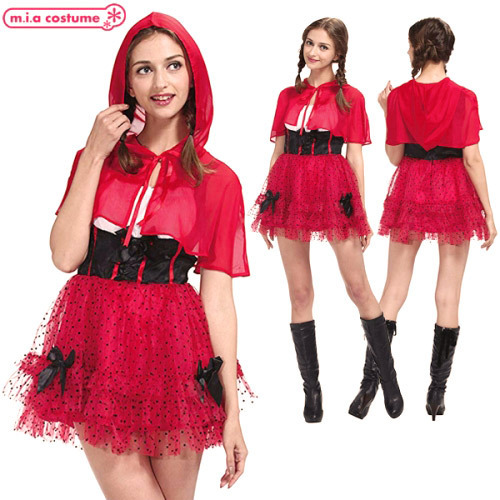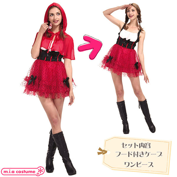 一味違った赤ずきんコスプレで周りと差をつける!ドット柄のチュールスカートと黒リボンで可愛く仕上げたコルセット風ミニスカワンピース。