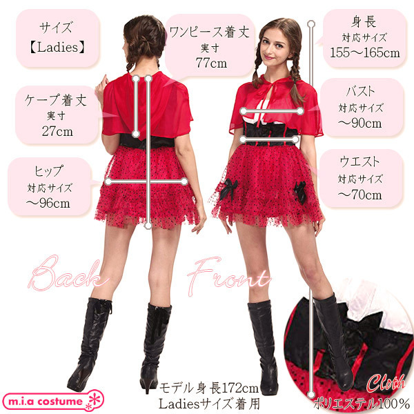 仕様:Ladiesサイズ:B〜90cm・W〜70cm・H〜96cm・身長155〜165cm・ケープ丈27cm・ワンピース丈77cm セット内容:フード付きケープ、ワンピース(背面ファスナー、スカート部に裏地あり) 素材:ポリエステル100%