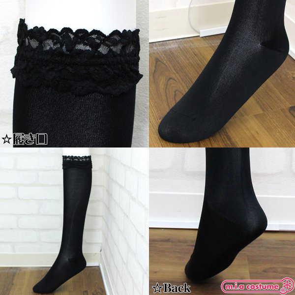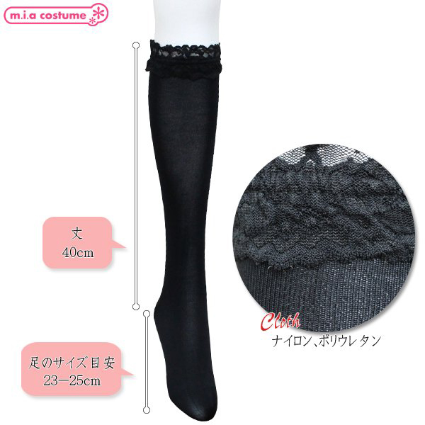 ソフトナイロンレース付ハイソックス 黒 無地 40cm丈 23〜25cm
