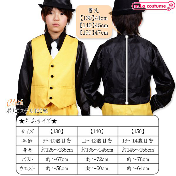 仕様:140サイズ 対応サイズ:身長135〜145cm・B〜72cm・W〜60cm 実寸:着丈45cm セット内容:ベスト単品(前ボタン) 素材:ポリエステル100%