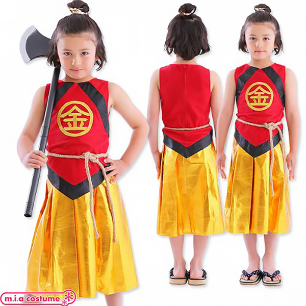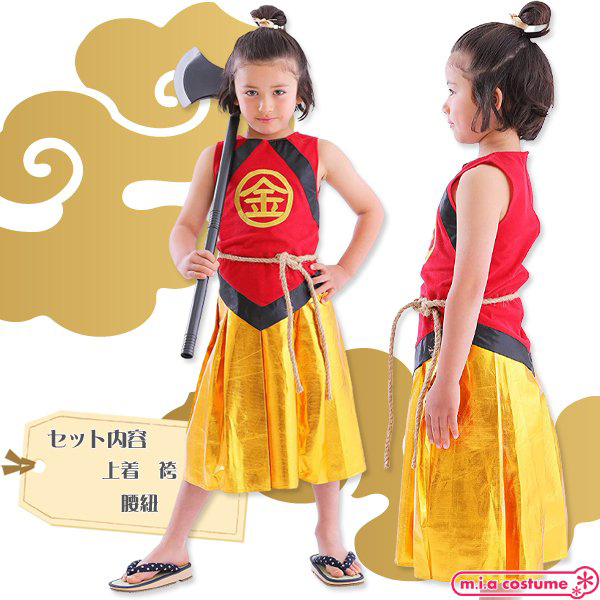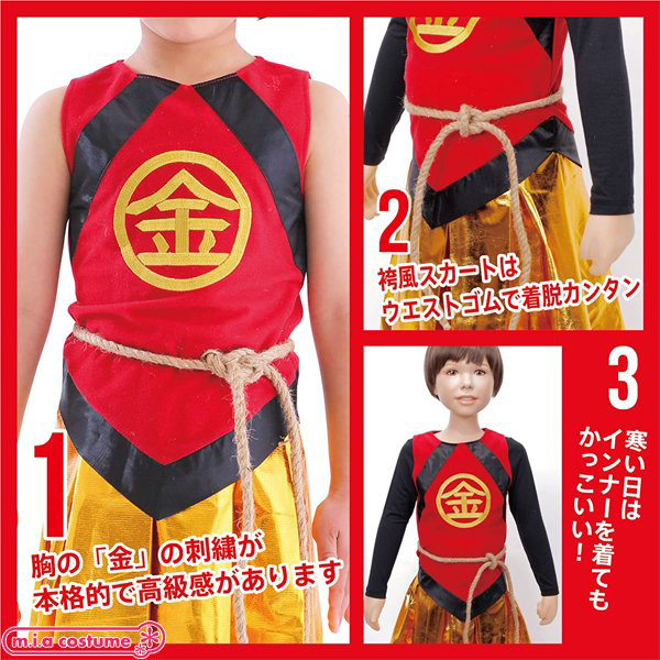 ありそうでなかった金太郎のコスチュームです♪胸の部分の「金」の刺繍が本格的で高級感があります!袴風スカートはウエストゴムで着脱も簡単♪寒い日はインナーを着用し、ベスト風に着てもかっこいいですよ。