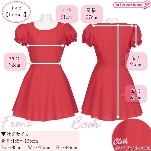 仕様:対応サイズ:身長155〜165cm・B〜90cm・W〜70cm・H〜96cm 実寸:B91cm・W72cm・肩幅37cm・袖丈20cm・着丈85cm セット内容:ワンピース単品(背中心ファスナー) 素材:ポリエステル100% モデル身長155cm
