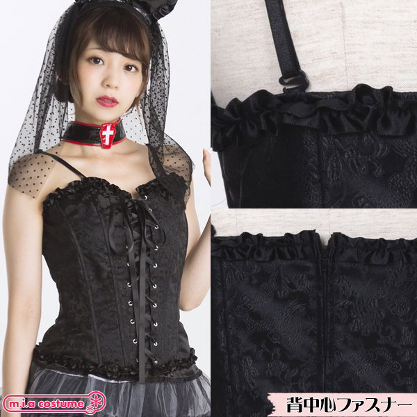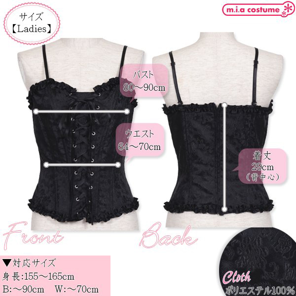 仕様:対応サイズ:身長155〜165cm・B〜90cm・W〜70cm・H〜96cm 実寸:B80〜90cm・W64〜70cm・着丈29cm(背中心) セット内容:コルセット単品(背中心ファスナー) 素材:ポリエステル100% モデル身長155cm