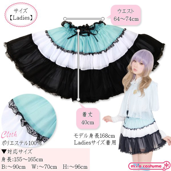 仕様:対応サイズ:身長155〜165cm・B〜90cm・W〜70cm 実寸:W64〜74cm・着丈40cm セット内容:パニエ単品(ウエストゴム) 素材:ポリエステル100% モデル身長168cm