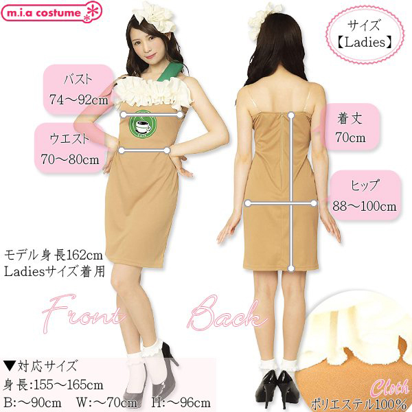 仕様:対応サイズ:身長155〜165cm・B〜90cm・W〜70cm・H〜96cm 実寸:B74〜92cm・W70〜80cm・H88〜100cm・着丈70cm(背中心) セット内容:カチューシャ、ワンピース(背中心ファスナー)、透明ストラップ、シール 素材:ポリエステル100% モデル身長162cm