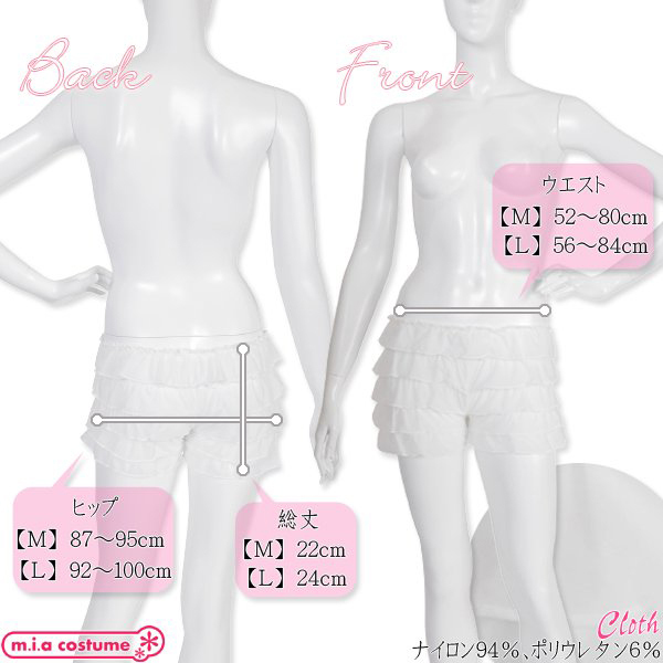 仕様:Lサイズ W56〜84cm・H92〜100cm・総丈24cm セット内容:ペチコートパンツ単品(ウエストゴム) 素材:ナイロン94%、ポリウレタン6% モデル身長162cm