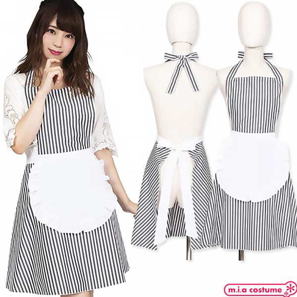 フリルの甘い雰囲気をストライプで!大人可愛い印象の細めのストライプ柄が特徴のエプロンです♪ウエストの白いフリルエプロンは一体型!首と腰でリボン結びするタイプだから体型に合わせてサイズの調整が可能です♪キッチンだけでなく、お料理教室、ギフト、ホームパーティーにも!アメリカンダイナーやウェイトレス風にもコーディネート出来るので学園祭、カフェイベントでの使用にもおすすめです。