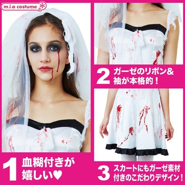 血まみれで恐怖の結婚式!血だらけの花嫁コスプレです♪ゾンビ・ホラー系の仮装コスチュームとして、ハロウィンパレードやお化け屋敷、仮装イベントにどうぞ!ウェディングドレス風の衣装で血糊はお好みでアレンジ♪ハロウィンのコスプレにもぴったりです。