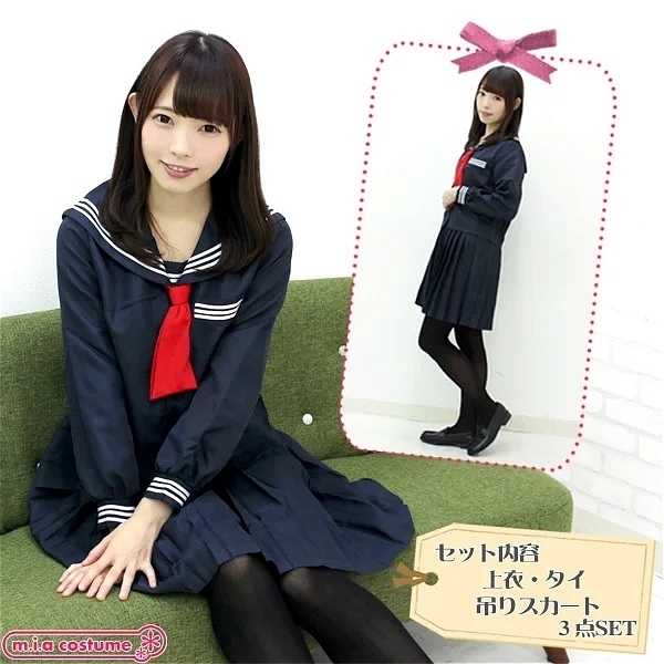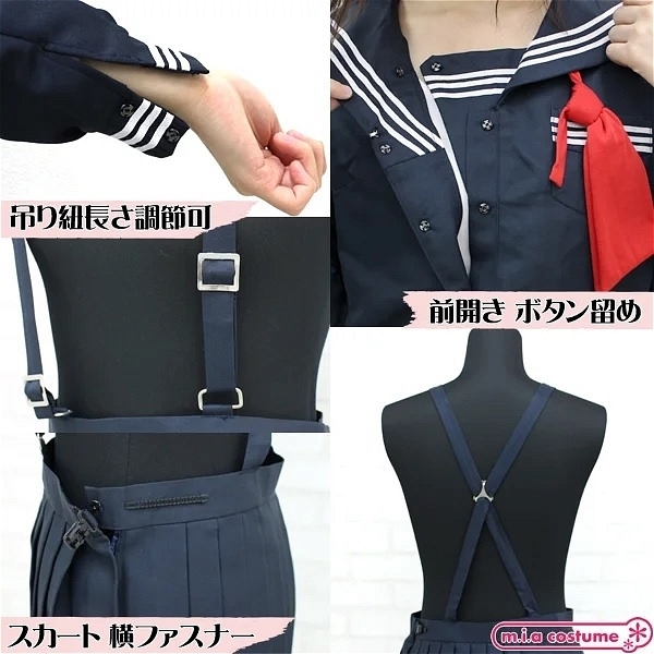 紺地に赤色はとっても映えます!シンプルなセーラー服ですが、吊りスカートがセットになっている本格派♪つくりはかなりしっかりとしているので本物と区別がつかないくらいのクオリティの高さです☆もちろん上下セットでお買い求めいただけます。