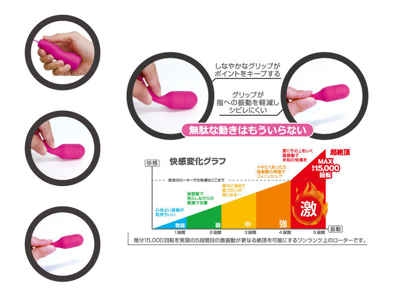 微弱〜激までの5段階調節で、未知の快感を得られるシングルローターです。