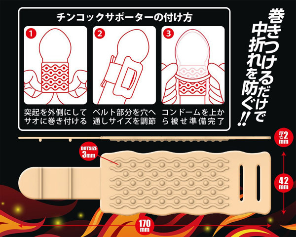 竿部分に巻きつけて固定し、コンドームを被せるだけの簡単仕様!中折れを防いで挿入をサポートしながら、パートナーへの刺激も出来る男性用補助グッズです。