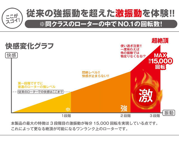 MAX15000回転する電マ並みのハイパワーな振動がアナタを極上の快楽世界へと導く…!ひとりエッチにもパートナーとのイチャイチャプレイにも大活躍する究極のシングルローターです。