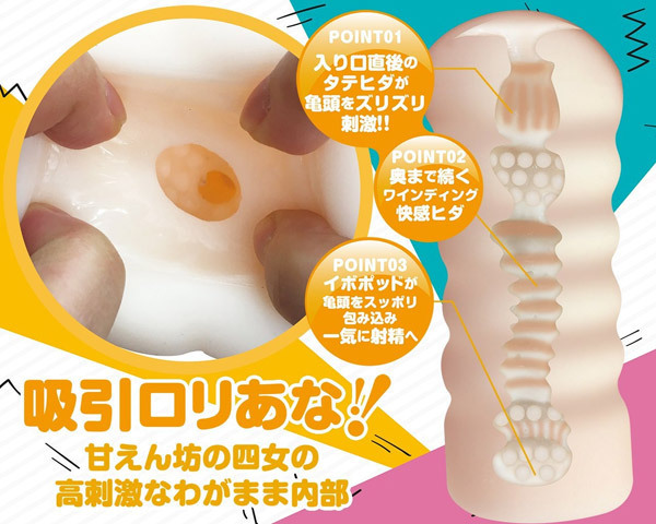 『おなガール』の血を受け継いだ新シリーズ『おなシスタ』が登場!入り口直後の縦ヒダが亀頭をズリズリ刺激!奥まで続く快感ワインディングヒダを抜けた後は、イボポッドが亀頭をスッポリ包み込んで一気に射精へと誘います。