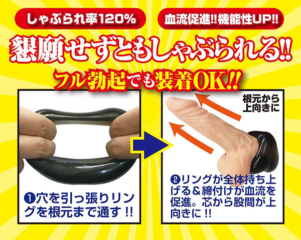 耐久性と伸縮性の高いエラストマー素材を使っているため、リングの中央に開いた穴を左右に引っ張るだけでフルボッキ状態でも装着可能♪リングをしっかりと根本まで通せるため、しゃぶられ率は120%を突破!根本から上向きにリング全体が持ち上がるので、締め付けによる勃起力アップと同時に血流促進&機能性アップも期待できそうです♪