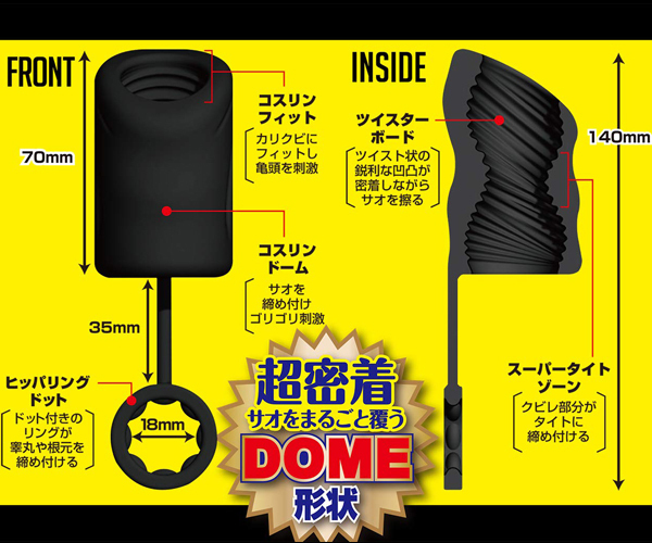 あのコスリングがパワーアップして帰ってきた!手コキ以上の快感×オナホ以上の衝撃が押し寄せる…ッ!新感覚オ〇ニーグッズ第2弾!!睾丸や根元を締め付けるリングはドット付きに進化し早漏防止&勃起力UP!!竿をまるごと覆う超密着なDOME形状が全体を包み込みハードに締め付ける!ツイスト状の凹凸がゴリゴリと責め、内部のクビレ部分が単調ではない刺激を生み出します。