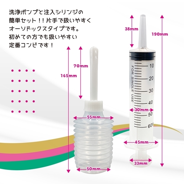 60mlのシリンジとロングノーズポンプがセットになった便利なオールインワンタイプです♪片手で簡単に操作できる設計で、初心者の方でも安心して使えます!シリンジは目盛りが見やすく、正確な注入が可能♪ロングノーズポンプは70mmの長さで細部までしっかり届き、スムーズな洗浄が行えます!キャップ付きなので使用後も衛生的に保管でき、清潔さをキープ♪お手入れも簡単で、長くご使用いただけます!安心の設計と使いやすさを兼ね備えた洗浄注入セットで、快適なケアをサポートします♪