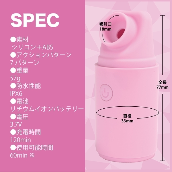 仕様:パッケージ:12.7×5.3×5.0cm 本体:全長7.7cm・蓋2.9cm・吸引口径1.8cm・持ち手径3.3cm 重量:57g USB充電式