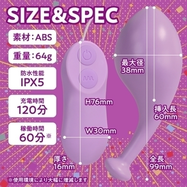 仕様:本体サイズ:コントローラー:3.0×7.6×1.6cm ローター:全長9.9cm×挿入長6.0cm 最大径3.8cm 重量:64g USB充電ケーブル USB充電式