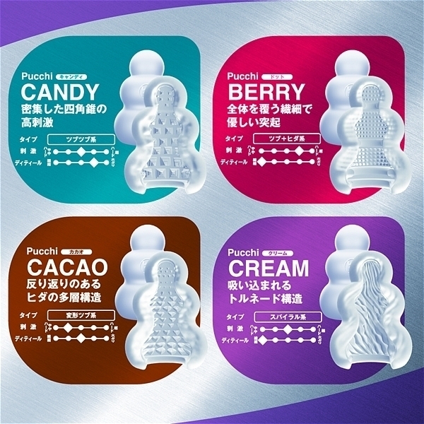 <キャンディー内部構造>「密集した四角錐の高刺激」整然と敷き詰められた四角錘の突起<クリーム内部構造>「吸い込まれるトルネード構造」斜めに擦り上げてくるヒダはクリームのように昇りつめる絶頂感<ベリー内部構造>「全体を覆う繊細で優しい突起」フワフワとした起毛が包み込みまったりしたなめらかな触感<カカオ内部構造>「反り返りのあるヒダの多層構造」ビッシリ並んだヒダは反発しながら複雑に絡みつく刺激