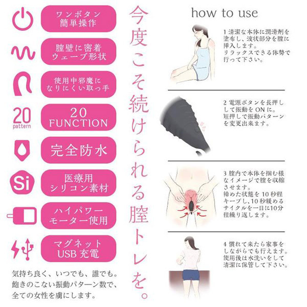 こまめに挿入してトレーニングすることで徐々に膣圧アップ!取り出しやすいスマートな取っ手は邪魔にならないので、普段の生活をしながらでもトレーニング可能。