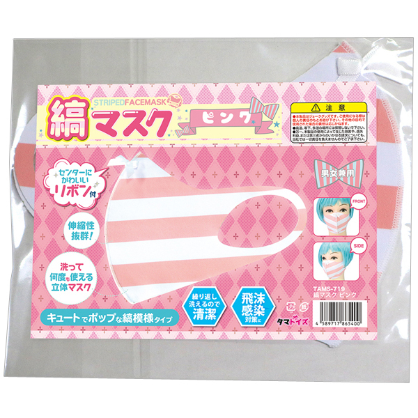 顔にピタッとフィットする伸縮性抜群の可愛い縞パン風立体マスク(ピンク)。