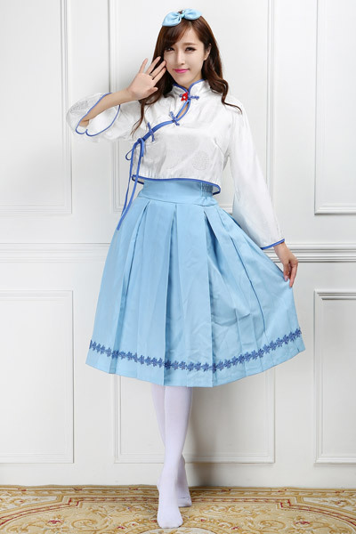 ハロウィンやコスプレイベントには白×青の清楚系な中華風ロリータで!歌うバーチャルアイドルの衣装をモチーフにしたコスチューム♪チャイナ服を彷彿とさせるデザインとツヤっとした白い生地のトップスに、サックスブルーのスカートとリボンがセットになった衣装。