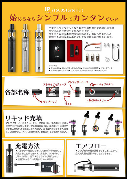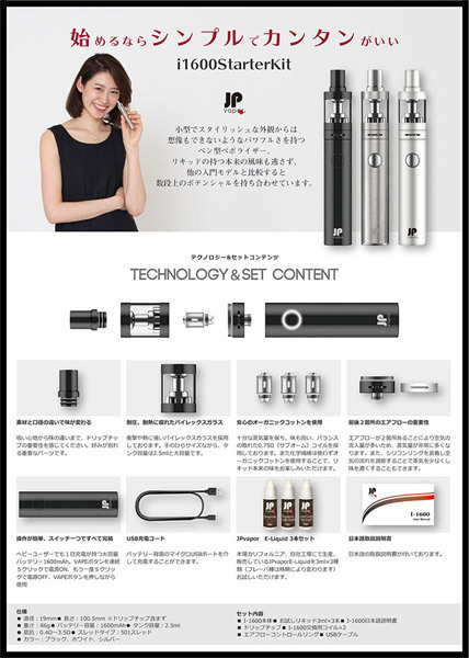 仕様:パッケージ:12.5×9.0×4.9cm 本体:12.0×1.9cm セット内容:I−1600本体、お試しリキッド3ml×3本、日本語説明書、ドリップチップ、交換用コイル×2、エアフローコントロールリング、USBケーブル USB充電式
