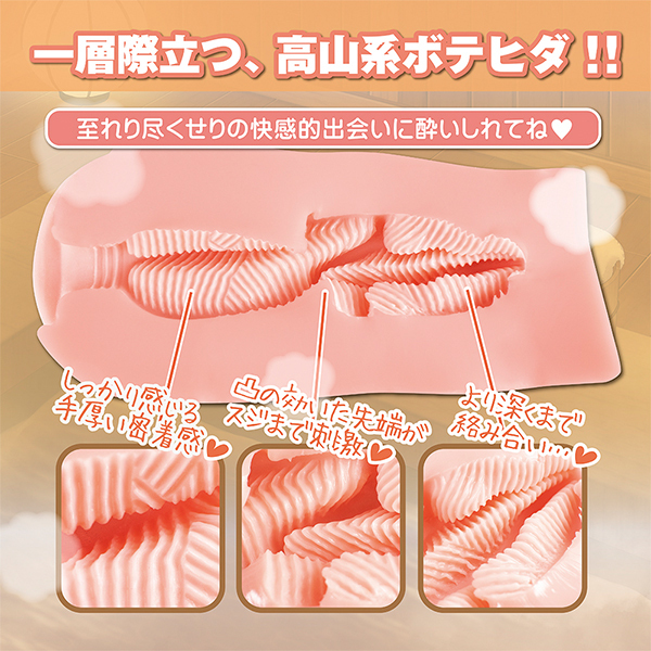 密着感が気持ちいいと大好評のオナホ「温泉欲情」に第2弾!包まれるような肉感とフィット感はそのままに、先端からスジまで、角ばったヒダ群が刺激し絡みつく高山系ポテヒダ構造で仕上げました♪素材には人肌質感のヒトハダマテリアルを採用!嫌なニオイ、ベタつきを抑えた本物志向の質感。