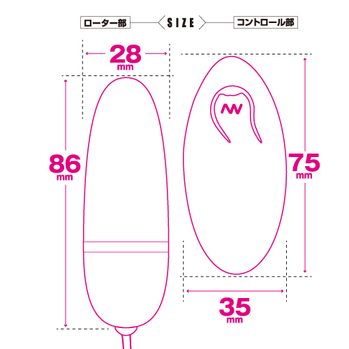 仕様:パッケージ:16.5×9.0×5.0cm 本体:ローター8.6×2.8cm・コントローラー全長7.5cm 重量:182g 電池:本体(単四電池×1本使用)、コントローラー(単四電池×1本使用)