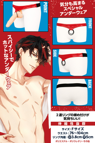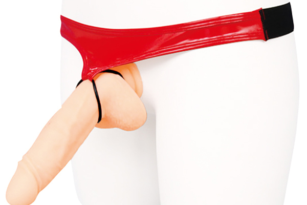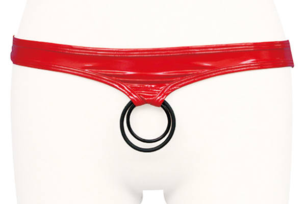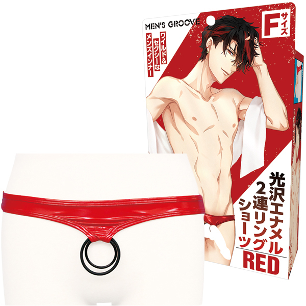 光沢感のある赤いエナメル素材が気分高める2連リング付のメンズショーツ。