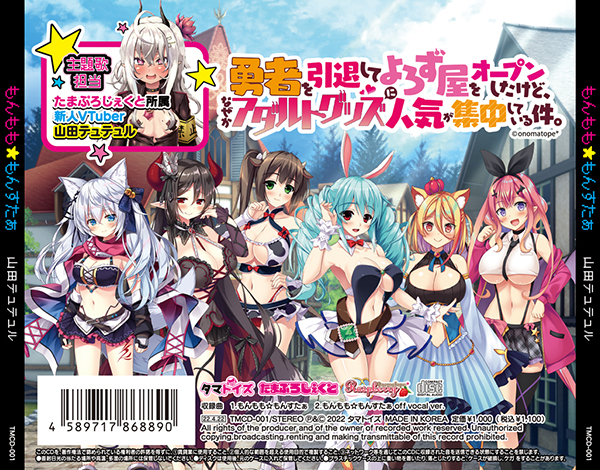 収録内容は主題歌「勇者を引退してよろず屋をオープンしたけど、なぜかアダルトグッズに人気が集中している件」♪主題歌担当はたまぷろじぇくと所属の新人Vtuber山田テュテュル!と「もんもも☆もんすたぁ off vocal ver. Vocal」です。
