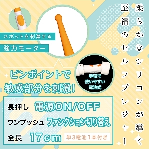 仕様:パッケージ:19.3×9.0×2.5cm 本体:全長17.0cm(シリコン部分7.5cm)・最大径1.7cm 電池:単三電池×1本使用