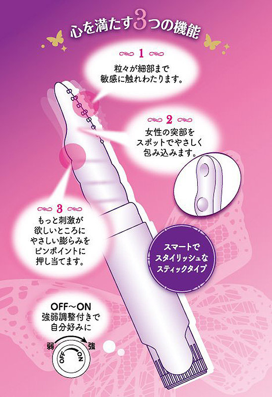●スマートなスティックタイプ●先端は弾力のある心地よい柔らかさのシリコン素材●底部をひねるだけで電源ON/OFFから強弱振動まで操作可能。