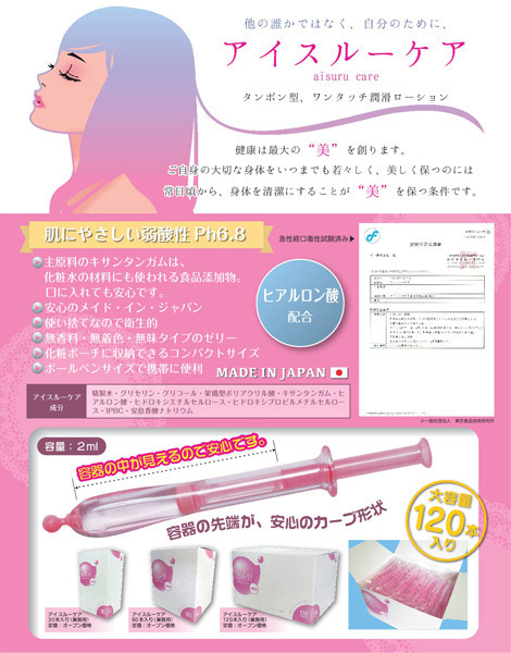 ●ワンタッチで注入できる注射器タイプ●一回使い切りの個包装で衛生的●自然に潤う無香料・無着色●身体にやさしい成分を配合した弱酸性。