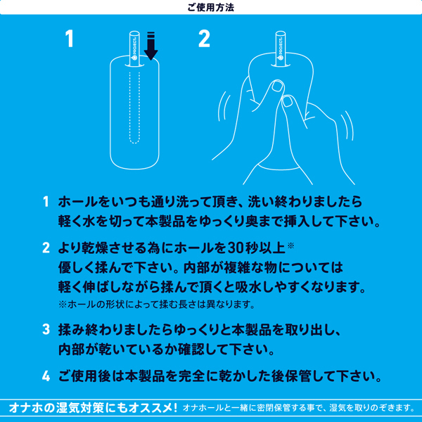 オナホを洗った後に挿しこんで揉むだけで速乾燥。
