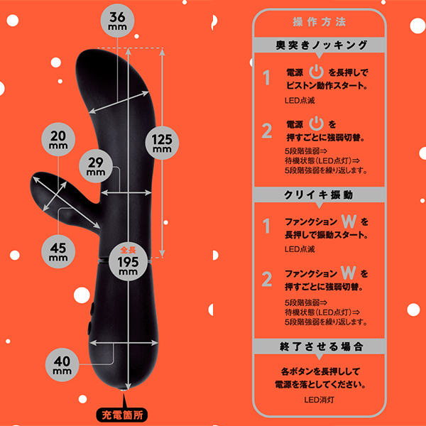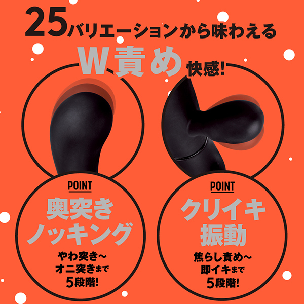ピストンは5段階、クリバイブの振動も5段階、焦らしから即イキまで計25通りのバリエーションから味わえるダブル責めの快感で満足必至♪電源はマグネット端子のUSB充電式でフル充電210分で連続稼働時間は約30分です。