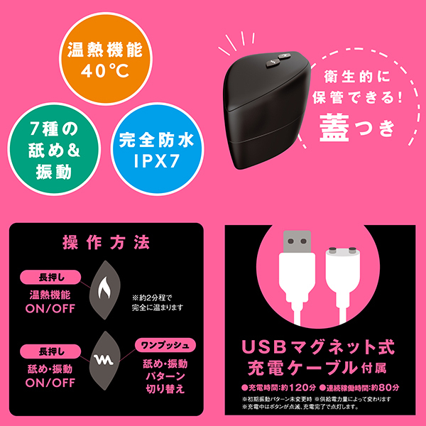 アツくて甘〜い愛のご奉仕クンニ_超!愛を感じる舐めローター!彼の熱い舌を思い出す温感機能は40℃まで温まる人肌温度_先っぽで刺激するチロチロクンニからグイグイ舐め上げる激しいクンニまで多彩なクンニが楽しめちゃう_さらに7パターンの振動機能付き!震えるあったかベロでとろける濃密前戯_やっぱりクンニがナンバー1!!!完全防水なので使用後のお手入れもラクチン♪敏感な部分に直接使うものだから、優しい肌あたりの高品質ソフトシリコンを使用しました。