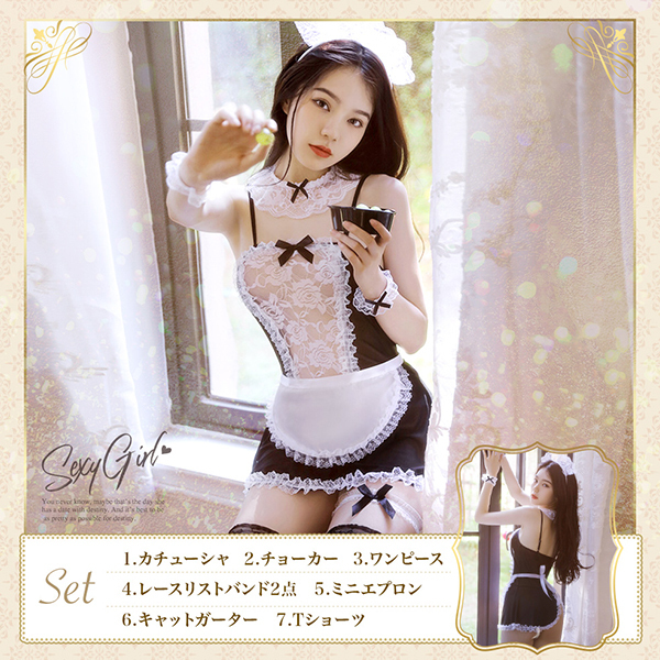 仕様:フリーサイズ セット内容:カチューシャ、チョーカー、ワンピース、レースリストバンド×2、ミニエプロン、キャットガーター、Tバックショーツ